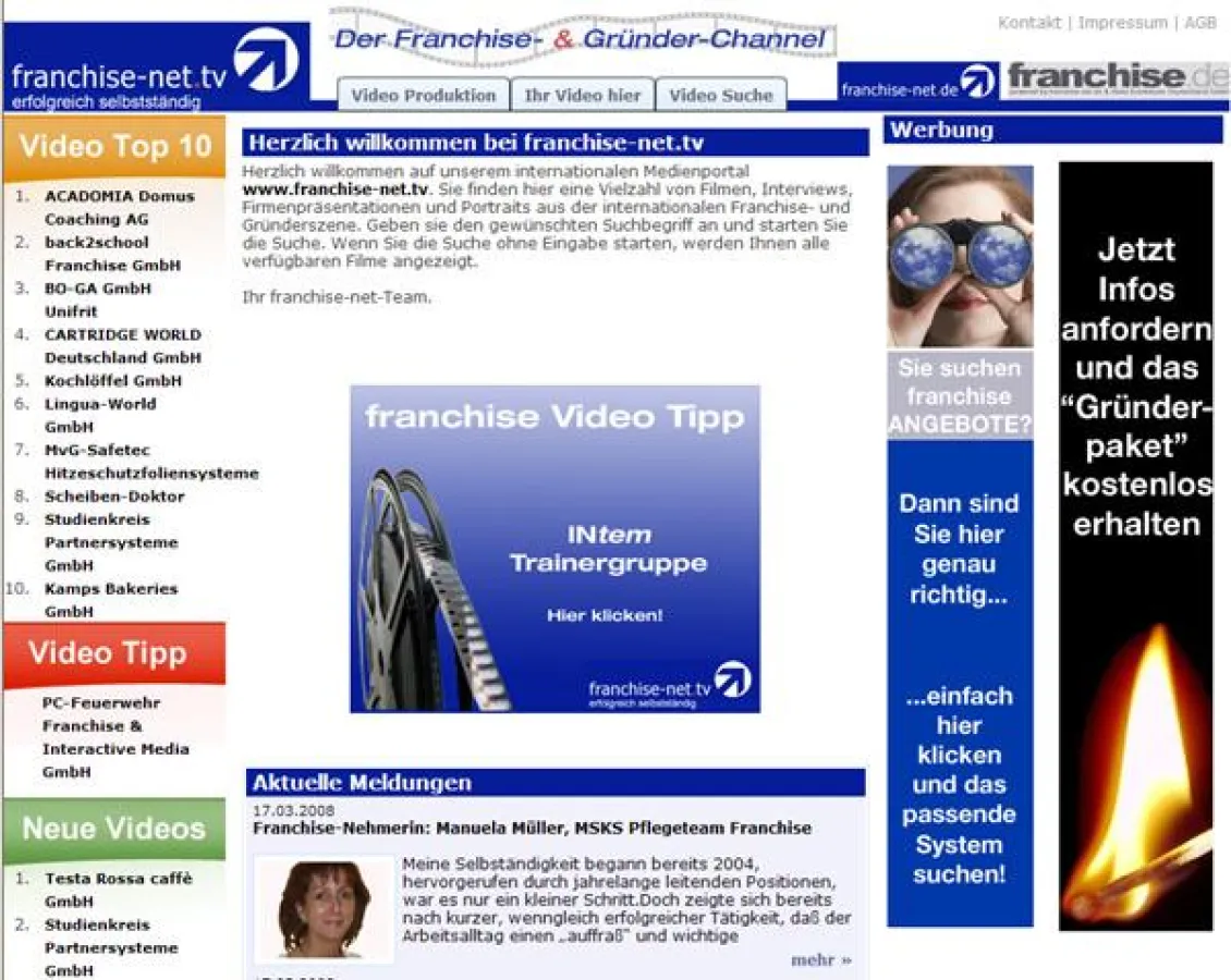 franchise-net.tv, des Videoportal, hat seine Website relauncht: Seit 1. März 2008 ist nicht nur das Design, sondern auch die Seitenstruktur komplett überarbeitet. Daraus ergeben sich ganz neue Möglichkeiten für Franchise-Interessenten wie Franchise-Geber.