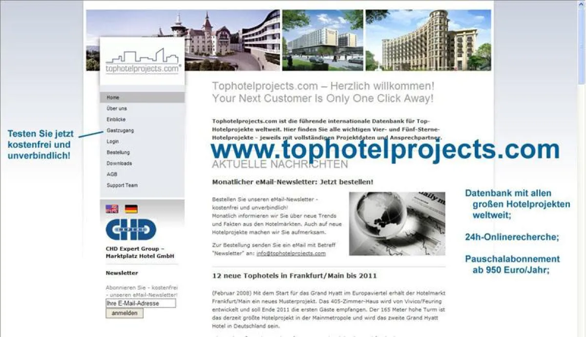 Neu bei tophotelprojects.com ist auch der eMail-Newsletter, der kostenfrei bezogen werden kann. Monatlich wird darin über neue Hotelprojekte aus dem Datenbestand von tophotelprojects.com und über Entwicklungen auf den Hotelmärkten berichtet. Der Service steht auch potentiellen Abonnenten zur Verfügung. Zur Bestellung senden Sie ein eMail mit Betreff „Newsletter“ an E-Mail.