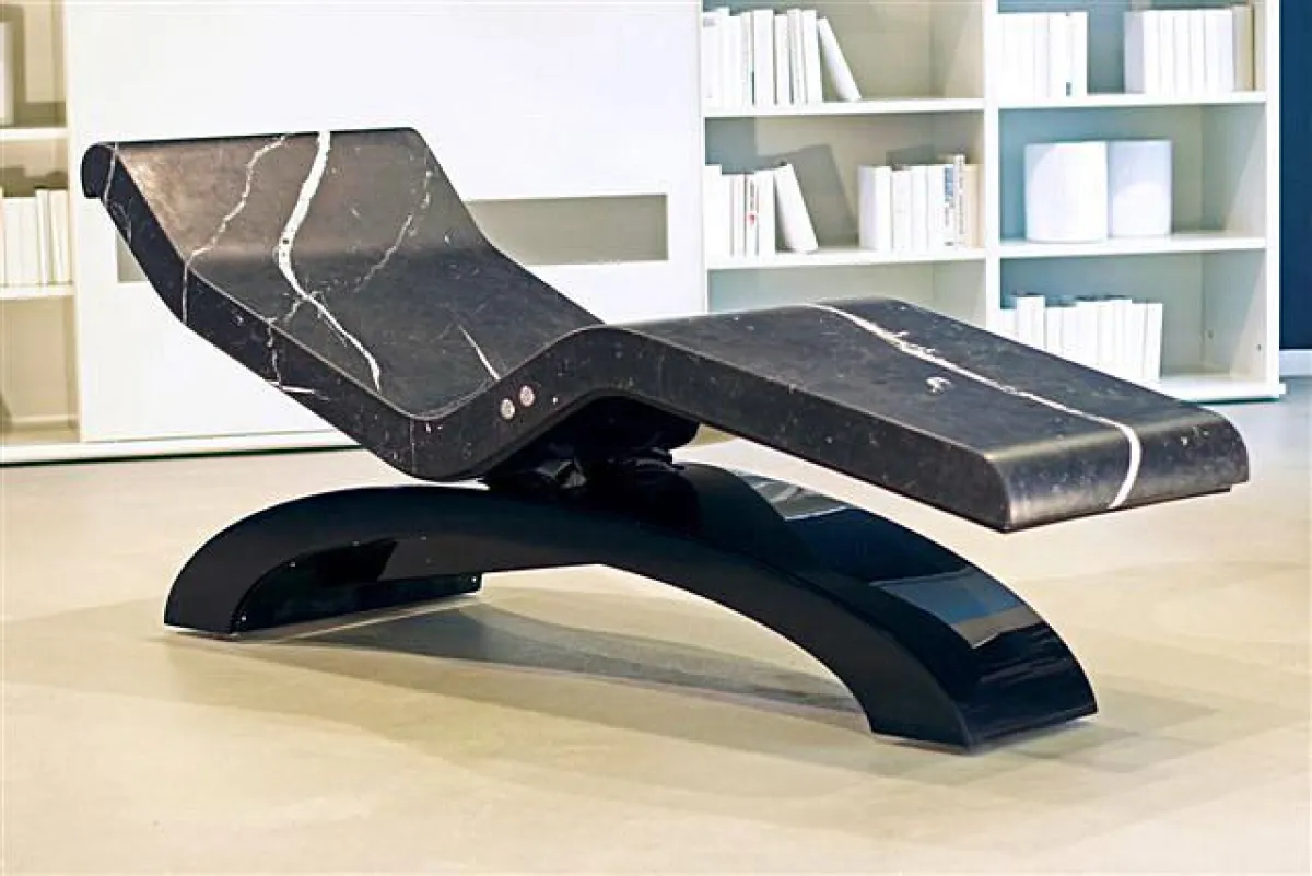 Seit 2004 entwickelt Fabio Alemanno Marmorskulpturen mit therapeutischen Effekten. Das ergebniss ist die Cleopatra Hot Stone Chaise Longue mit drei möglichen Marmorarten und drei verschiedene Unterkonstruktionen.