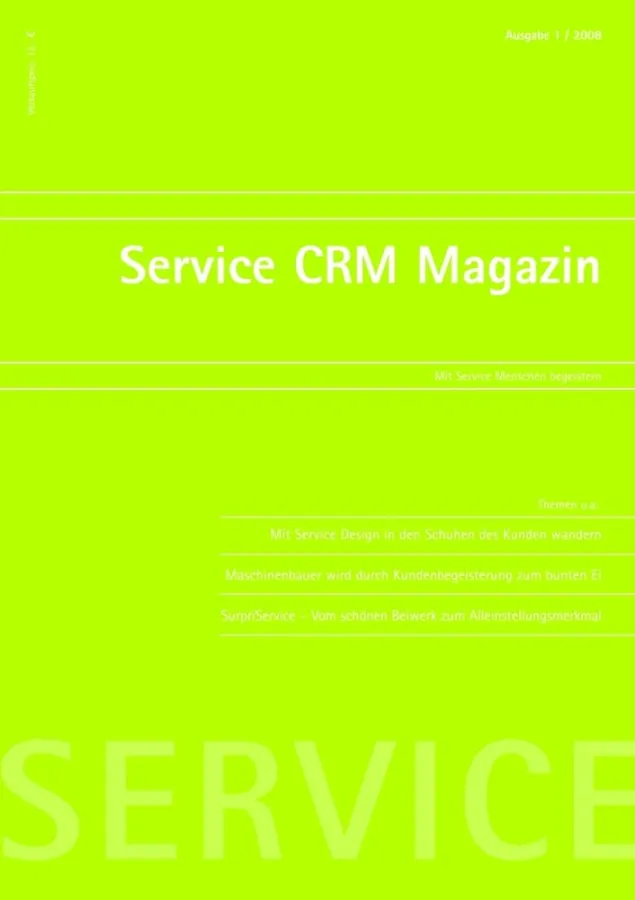 (openPR) Mit fundierten Fachartikeln, innovativen Ideen und aktuellen Informationen rund um das Thema "Mit Service Menschen begeistern" startet das erste deutsche Service CRM Magazin. Als Wissensquelle für Geschäftsführer, Service- und IT-Leiter soll die Zeitschrift wertvolle Beispiele aus Unternehmen liefern, welche die Kunst, Kunden zu begeistern, bereits leben. Eine spannende Mischung aus Fachartikeln, zum Teil mit wissenschaftlichem Hintergrund, sowie kurzen Beiträgen liefert den Lesern praxisnahes Wissen ebenso wie wertvolle Denkanstöße. Herausgeber Norbert Samhammer ist überzeugt: „Marktführender Service benötigt die gleiche langfristige Entwicklungsleistung wie marktführende Produkte.“ Damit Unternehmen daran arbeiten und sich weiterentwickeln können, bietet das Magazin die Themenschwerpunkte Werkzeuge (um Service Prozesse praxisbezogen zu unterstützen), fundierte Methoden (auf welchen Service Excellence beruht) sowie Controlling (Verfahren und Kennzahlen zur Qualitätssicherung im Service). Ergänzt wird das Ganze durch aktuelle Veranstaltungshinweise. Geplant für 2008 sind vorerst zwei Ausgaben (Mitte April sowie Mitte September) mit einer Startauflage von 10 000 Exemplaren. Mehr zum neuen Service CRM Magazin gibt es unter www.servicecrmmagazin.de