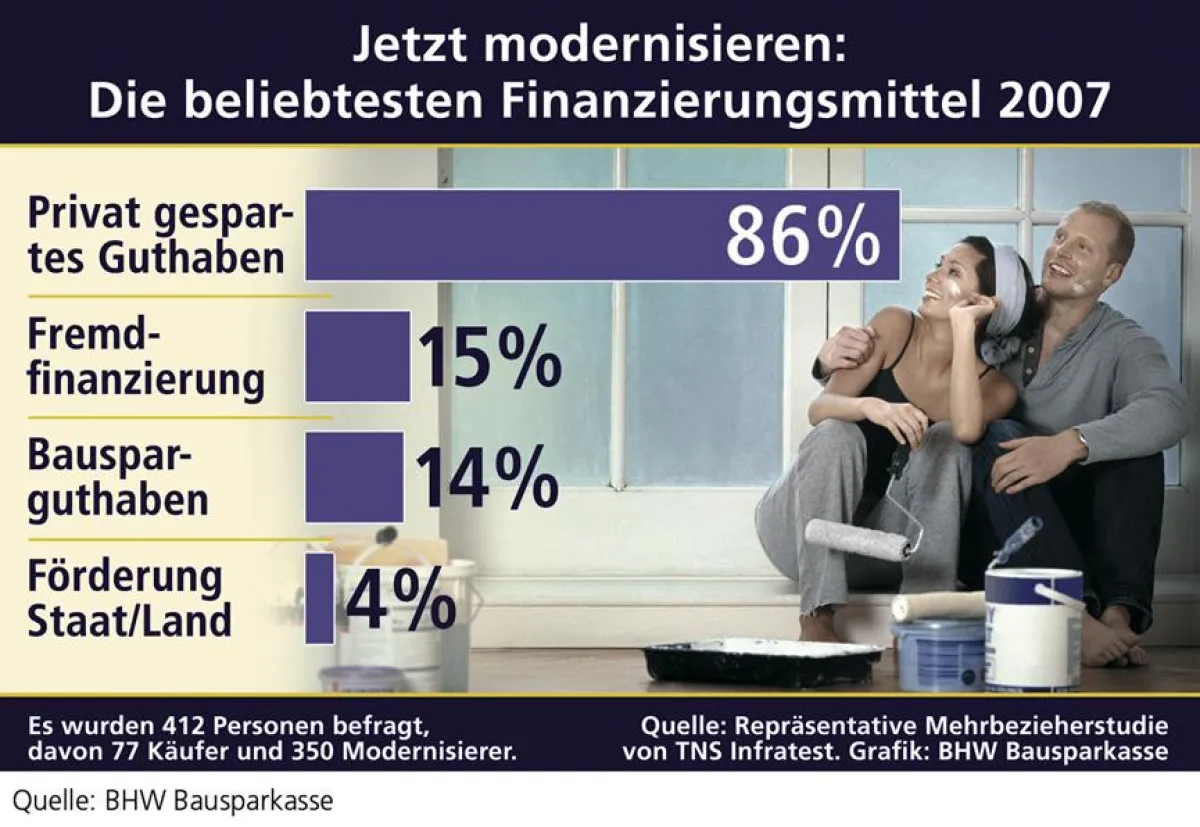 Jeder zehnte Haushalt in Deutschland hat im vergangenen Jahr in eine Immobilie investiert. Im Durchschnitt betrug der finanzielle Aufwand für den Kauf bzw. Neubau eines Eigenheims gut 140.000 Euro, für Modernisierungen bzw. Renovierungen knapp 20.000 Euro. Das zeigt eine repräsentative Studie von TNS Infratest (mit 412 Interviews), die von der BHW Bausparkasse in Auftrag gegeben wurde. 57 Prozent der Bauherren und Käufer griffen auf Fremdmittel wie Bauspardarlehen, Kredit oder Hypothek zurück. 19 Prozent nutzten Bausparguthaben, 10 Prozent Zuschüsse vom Staat oder Land. Beim Modernisieren beanspruchten 15 Prozent der Deutschen die Fremdfinanzierung, 14 Prozent Bausparguthaben und 4 Prozent Förderungen von Staat oder Land.