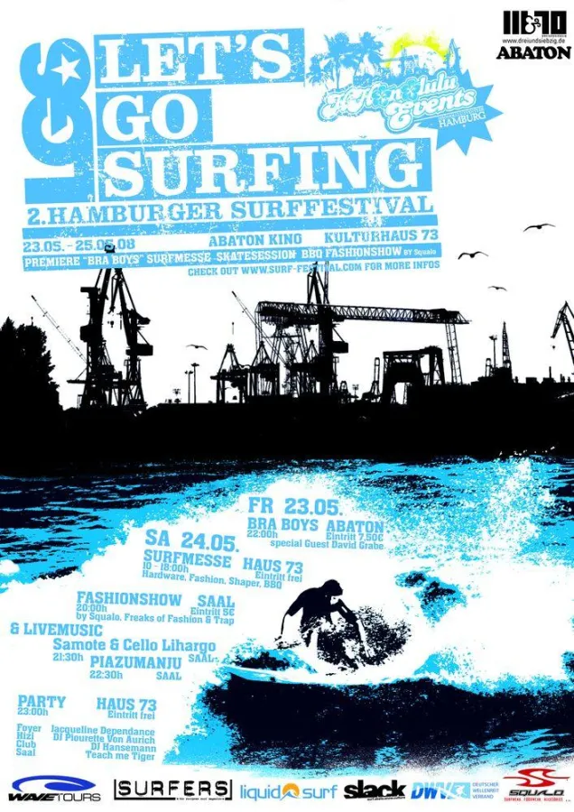 Zum zweiten Mal findet vom 23. bis 25. Mai das Surffestival in Hamburg statt. Auch dieses Jahr wird die Stadt unter dem Motto „LGS - Lets Go Surfing“ zu Deutschlands heimlichem Surfmekka. „Nach dem begeisterten Ansturm im vergangenen Jahr, möchten wir den norddeutschen Surfern auch dieses Jahr wieder einen Ort geben, an dem sie sich austauschen und wohlfühlen können.“ so Florian Laudon vom Veranstalter HHonolulu Events. Über drei Tage gibt’s auf dem 2. Hamburger Surffestival Movies, Mode und Musik für Surfer und solche, die es noch werden wollen.