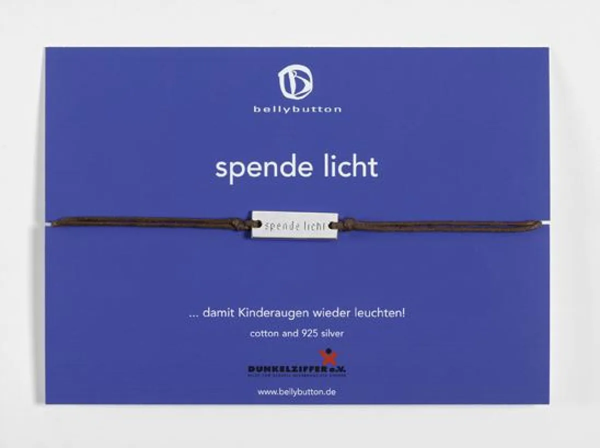 Deshalb unterstützt bellybutton die wichtige Arbeit von Dunkelziffer e.V. und die Aktion „Spende Licht“ mit einem liebevoll gestalteten Armband. Der Aufruf „Spende Licht“ ist auf einem wunderschönen Silberplättchen eingraviert, das an einem dunkelbraunen Band aus gewachster Baumwolle befestigt ist.