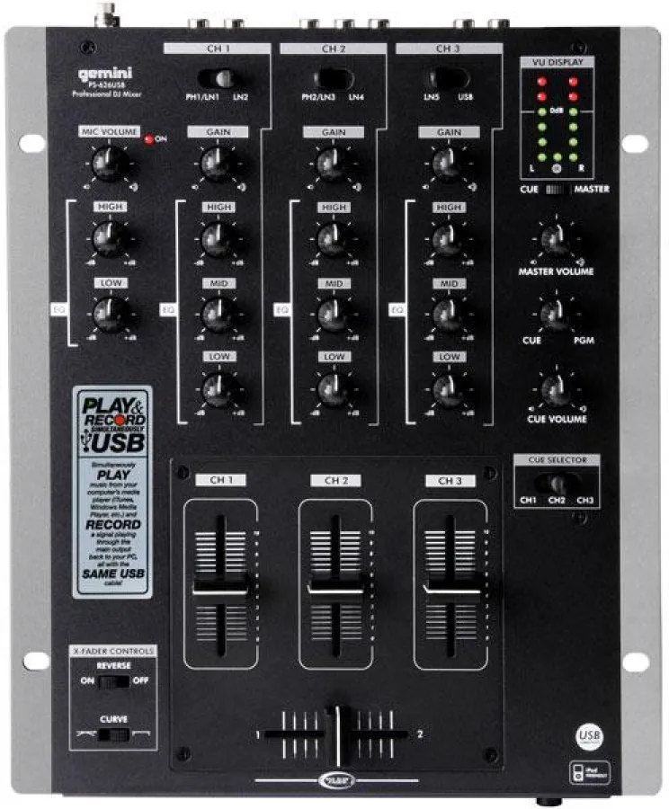 Neben dem USB Anschluss wartet der PS-626USB mit 4 Line Eingängen und 2 umschaltbaren Phono/Line Eingängen auf. Hier finden Plattenspieler und Line Signale an den hochwertigen Cinch Buchsen Anschluss. Auch ein iPod lässt sich mit dem mitgelieferten Kabel an das Mischpult anschließen.