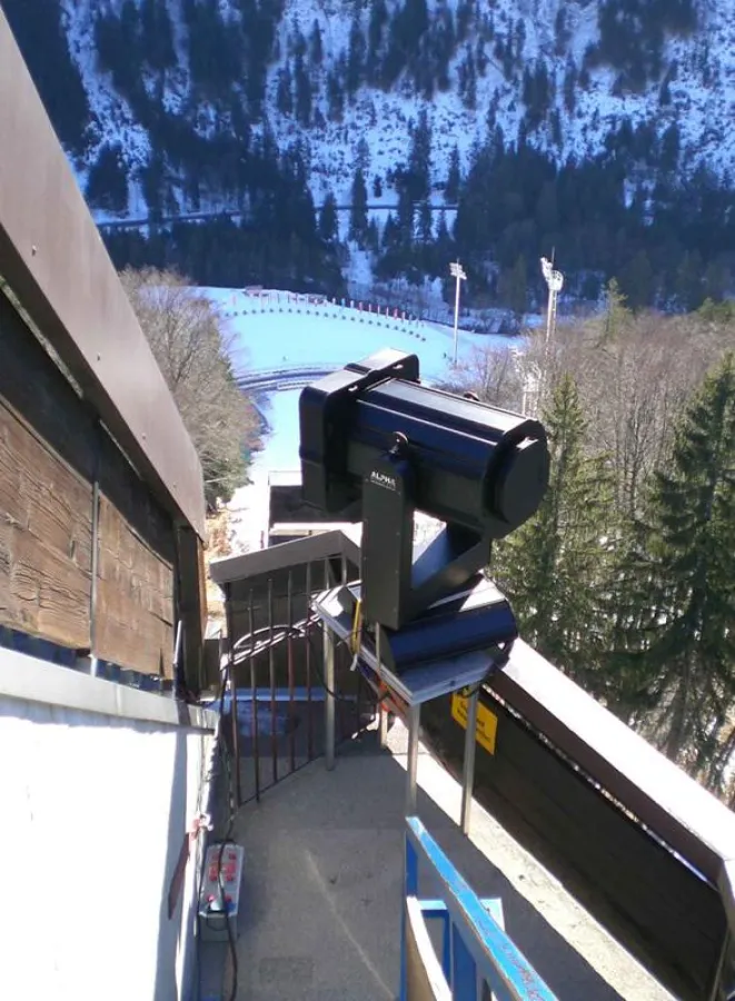 Für die Ergänzung der neuen fernsehgerechten Flutlichtbeleuchtung hat der international tätige Dienstleister aus Oyten bei Bremen die Order bekommen vier FALCON® BEAM 7000W an der 200 Meter über dem Stadion liegenden Schanze zu installieren. Dabei stellte das A&O Team zwei Lichtsysteme oberhalb der Absprungrampe links und rechts des Turmes am Anlauf auf. Das Equipment wurde mit einem Helikopter in Maßarbeit auf die relativ kleinen Plattformen gesetzt. Zwei weitere Scheinwerfer bekamen eine Positionierung unterhalb der Skiflugrampe.