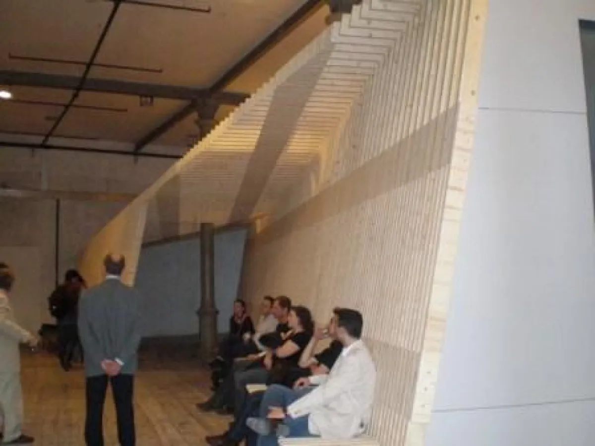 Im Anschluss an die Präsentationen stand ein Besuch des Semperdepots in Wien am Programm. Die ehemaligen Räumlichkeiten des Kulissendepots vom Theater an der Wien werden heute von der Akademie der Bildenden Künste als Studentenateliers genutzt. Mehrere permanente Einbauten aus CNC gefrästen Dreischichtplatten gliedern die großen Räume und machen Platz für Besprechungen oder Computerarbeitsplätze. Die Führung wurde von Herrn Stefan Gruber vorgenommen, welcher auch für dieses Projekt verantwortlich ist.