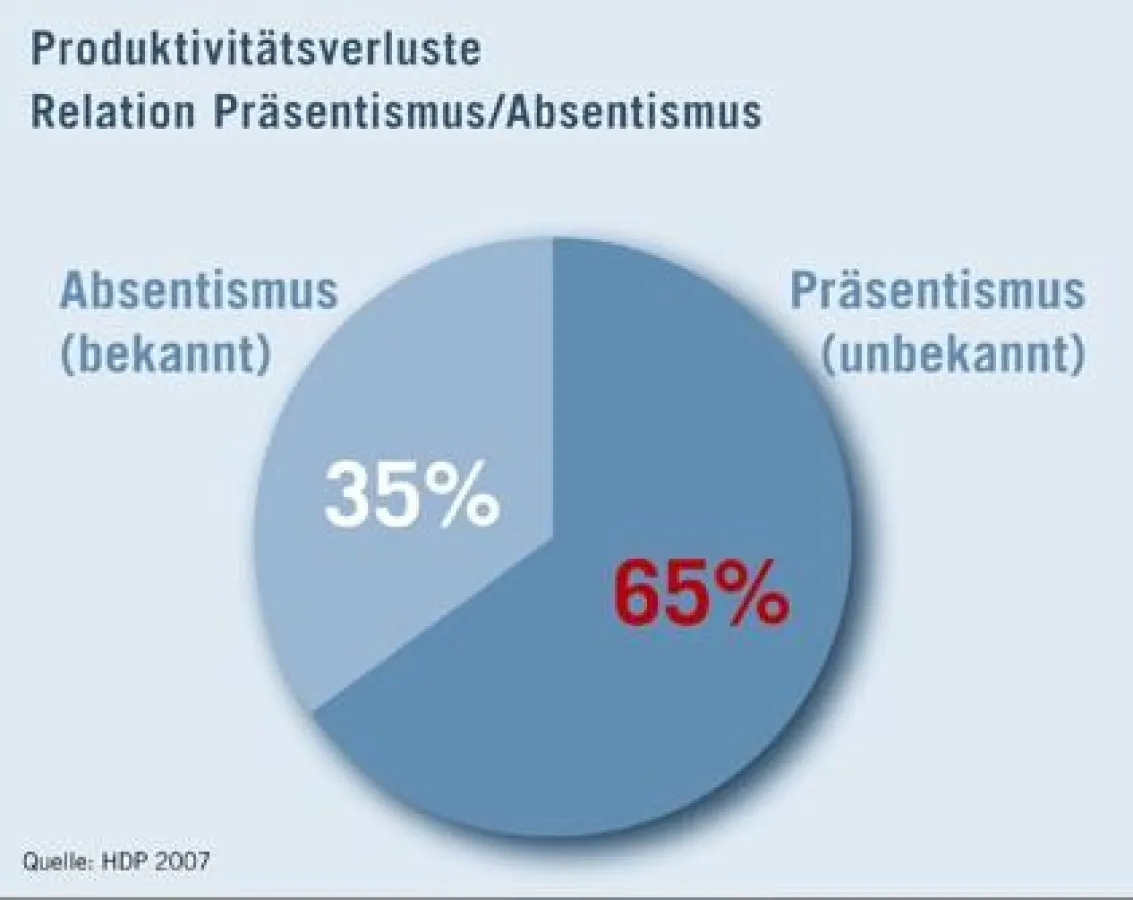 Durch gesundheitsbedingten Absentismus und Präsentismus gehen 10-15% der Gesamtproduktivität verloren. Zwei Drittel dieser Verluste werden durch Präsentismus verursacht. Nur ein Drittel entfällt auf Fehlzeiten.