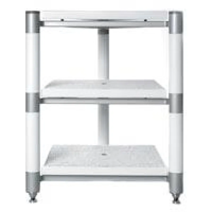 Die Stabilität der Dreieckskonstruktion ist äußerst hoch und widersteht jedem Schalldruck. Kräftige Bodenspikes aus Edelstahl, einzeln justierbar durch Feingewinde, halten zudem Bodenschwingungen fern. Die einzelnen Böden ruhen auf einstellbaren Spikes, eine Wasserwaagen-Libelle sorgt zudem für eine exakte Justierung.