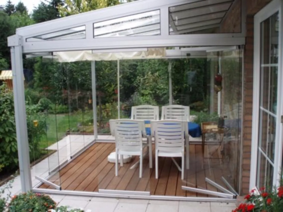 Für besseren Wetterschutz können Überdachungen, Terrassendächer oder Haustür-Vordächer mit seitlichen Elementen, aus Kunststoff oder Aluminium ausgestattet werden. Ein besonderes Highlight sind Ganz-Glas-Schiebe-Drehelemente mit niedriger, barrierefreier Bodenschwelle. Diese Schiebe-Drehelemente sind nicht miteinander verbunden, können leicht geöffnet und als Paket seitlich geparkt werden. Ein Blick in die Natur ist so ungehindert möglich.
