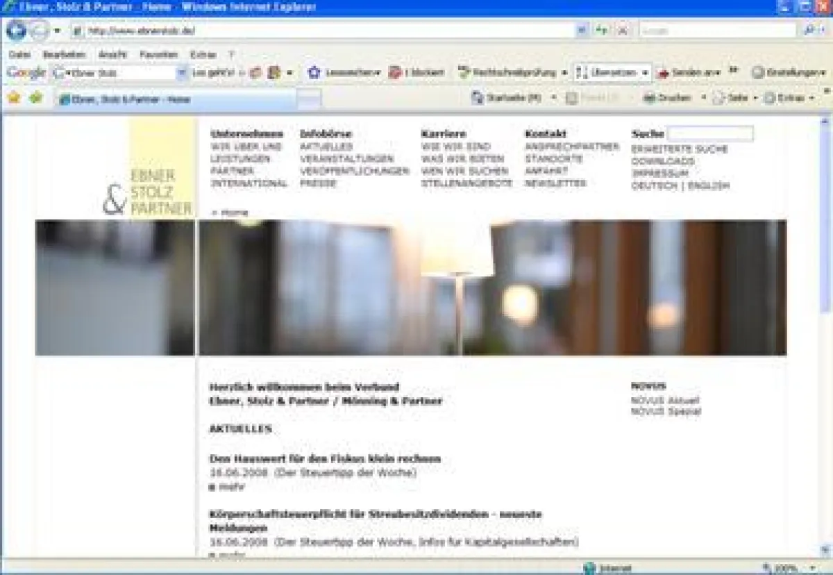 Ebner, Stolz & Partner hat die Six Content Management Lösung bereits seit 1998 für die Umsetzung des Webauftritts im Einsatz. Mit dem Relaunch der Website hat die Beratungsgesellschaft das Ziel verfolgt. den Internetauftritt nutzerfreundlicher und strukturierter zu gestalten. Das gesamte Angebots- und Leistungsspektrum wird übersichtlich dargestellt und mit aktuellen Informationen zu wichtigen Themen ergänzt. Der Besucher findet mit wenigen Klicks schnell den richtigen Ansprechpartner für konkrete Frage- und Problemstellungen. Hinzu kommen Komfort-Funktionen wie der Newsletter-Service nach einzelnen Fachbereichen, eine erweiterte Suchfunktion und die Möglichkeit für Downloads. Eine Stellenbörse unterteilt nach den neun Standorten sowie ein Veranstaltungskalender und Veröffentlichungen mit Kurzinfos zu aktuellen Themen wie beispielsweise neuen Urteilen, Steuertipps und Gesetzesänderungen bieten weitere interessante Informationen für Besucher.
