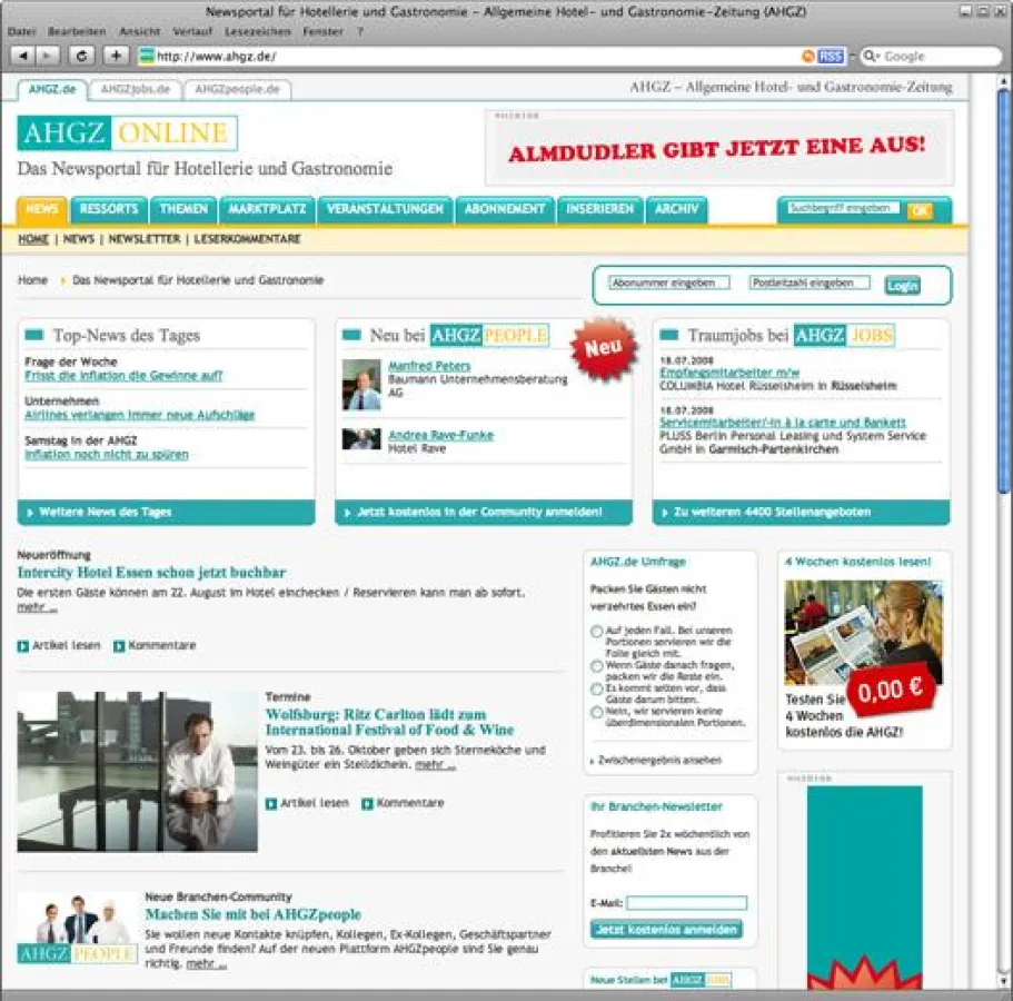 Stuttgart, 21. Juli 2008. Die Allgemeine Hotel- und Gastronomie-Zeitung (AHGZ) setzt in Sachen Online-Kompetenz auf die dmc digital media center GmbH. Aktuell wurde die brandneue Online-Community AHGZpeople und das weiterentwickelte Newsportal AHGZ.de ins Netz gestellt, welche von den Stuttgarter E-Business-Spezialisten gelayoutet und initial programmiert wurden. Damit baut die AHGZ als führendes Branchenmedium für das Gastgewerbe seine Online-Kompetenz noch weiter aus: Nachrichten, Netzwerk, neue Jobs – das alles gibt es für die Hotellerie und Gastronomie ab sofort online unter einem starken Markendach.