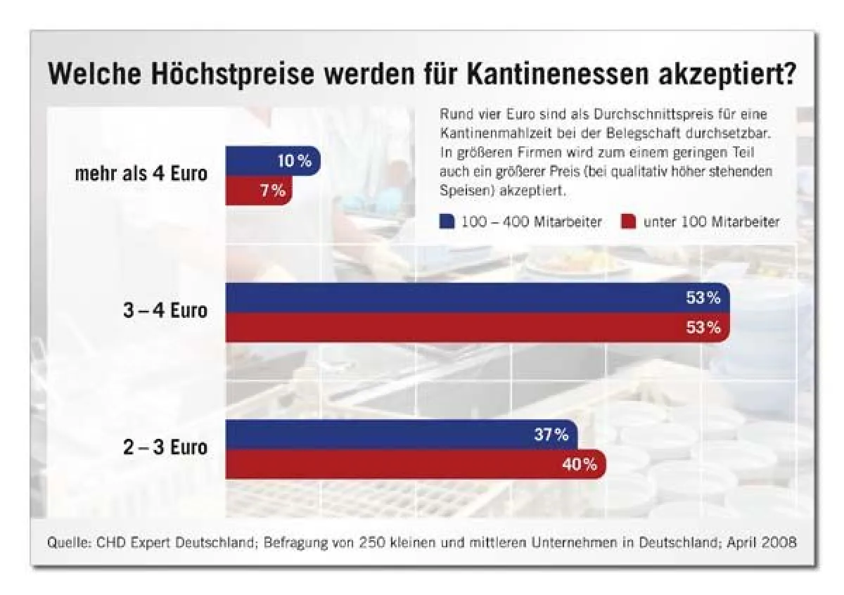 Hamburg, 21. Juli 2008 - Mitarbeiterverpflegung genießt auch im deutschen Mittelstand einen hohen Stellenwert: In den meisten Kantinen werden täglich drei bis vier unterschiedliche Hauptgerichte für maximal vier Euro angeboten. Dies geht aus einer Marktstudie des internationalen Marktforschungsinstitutes CHD Expert, Scheeßel bei Hamburg, hervor. Dazu wurden im Frühjahr die Inhaber oder Top-Entscheider von 250 kleinen und mittleren Unternehmen (KMU) befragt. Die Ausrichtung der Kantinen variiert jedoch nach Größe des Unternehmens. In Firmen mit weniger als 100 Mitarbeitern werden eher weniger Speisenvarianten zu günstigeren Preisen angeboten.