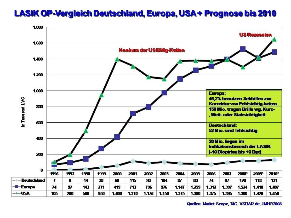 Nach anfänglicher Stagnation im Vergleich zu den USA und einem kurzfristigen Rückgang in 2006 zeigen die Werte wieder eine deutlich steigende Tendenz. Und trotz zunehmender Billigangebote aus dem Ausland, wird in den nächsten Jahren ein weiterer Anstieg an Augenlaserbehandlungen in Deutschland erwartet. Das Potential ist zweifellos vorhanden: Rund 52 Millionen Deutsche tragen Brille oder Kontaktlinsen, um Fehlsichtigkeiten wie Kurz-, Weit-, oder Stabsichtigkeit auszugleichen. Und mehr als die Hälfte davon, mit einer Kurzsichtigkeit bis zu -10 Dioptrien bzw. einer Weitsichtigkeit bis zu +4 Dioptrien, ist für eine moderne LASIK-Operation geeignet. Wie die Operationszahlen in Deutschland widerspiegeln, ist dabei das Interesse über die letzten 12 Jahre kontinuierlich gewachsen: Wurden im Jahr 1996 nur 7.000 Eingriffe durchgeführt, so waren es im Jahr 2000 bereits 60.000 und im vergangenen Jahr 97.000. Der Erfolg spiegelt sich auch international wider: Im Jahr 2007 wurden in ganz Europa knapp 1.400.000 LASIK-Operationen durchgeführt, erstmals ebenso viele wie in den USA. Insgesamt wurde das weltweit am häufigsten eingesetzte Verfahren zur operativen Korrektur von Fehlsichtigkeit bereits millionenfach angewandt.