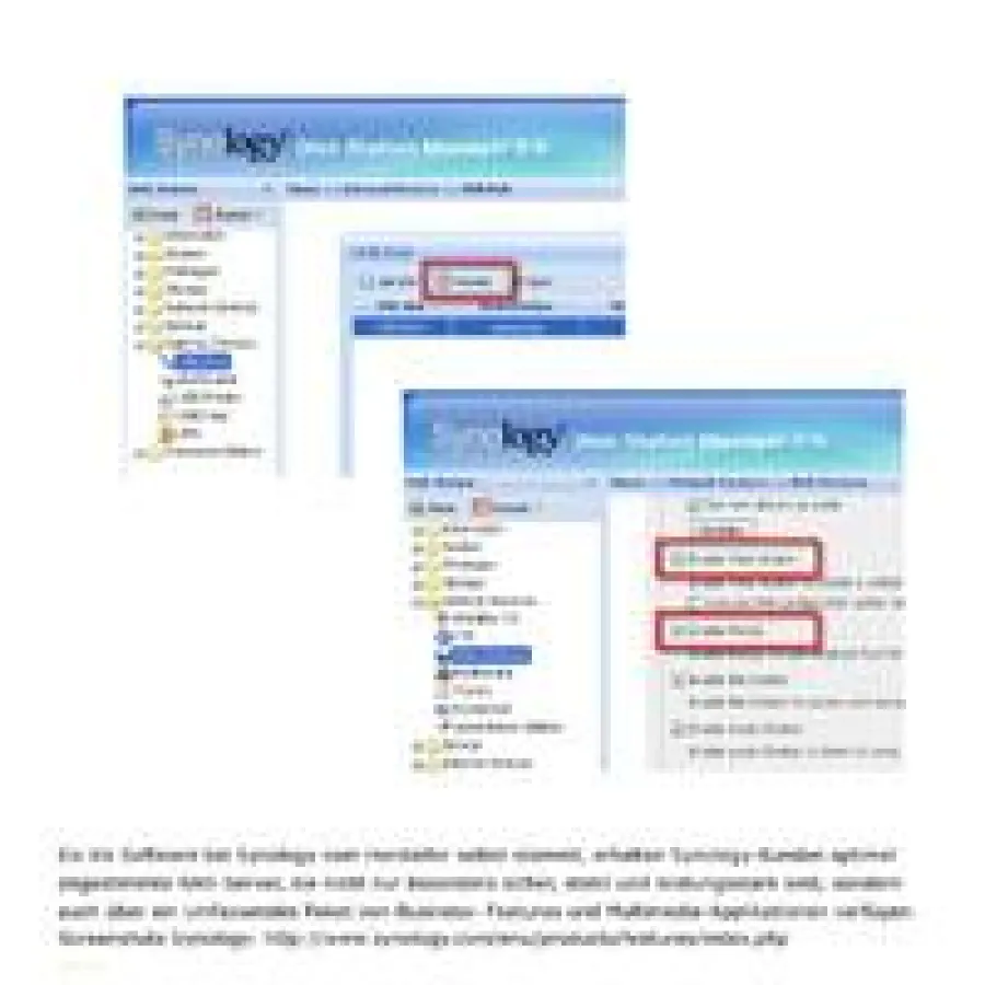 Da die Software bei Synology vom Hersteller selbst stammt, erhalten Synology-Kunden optimal abgestimmte NAS-Server, die nicht nur besonders sicher, stabil und leistungsstark sind, sondern auch über ein umfassendes Paket von Business- Features und Multimedia-Applikationen verfügen. Zudem erhalten alle Synology-Kunden die Möglichkeit, ihre NAS-Server regelmäßig mit der aktuellen Firmware upzugraden und damit immer auf dem neuesten Stand in punkto Benutzerfreundlichkeit und Applikationen zu sein.