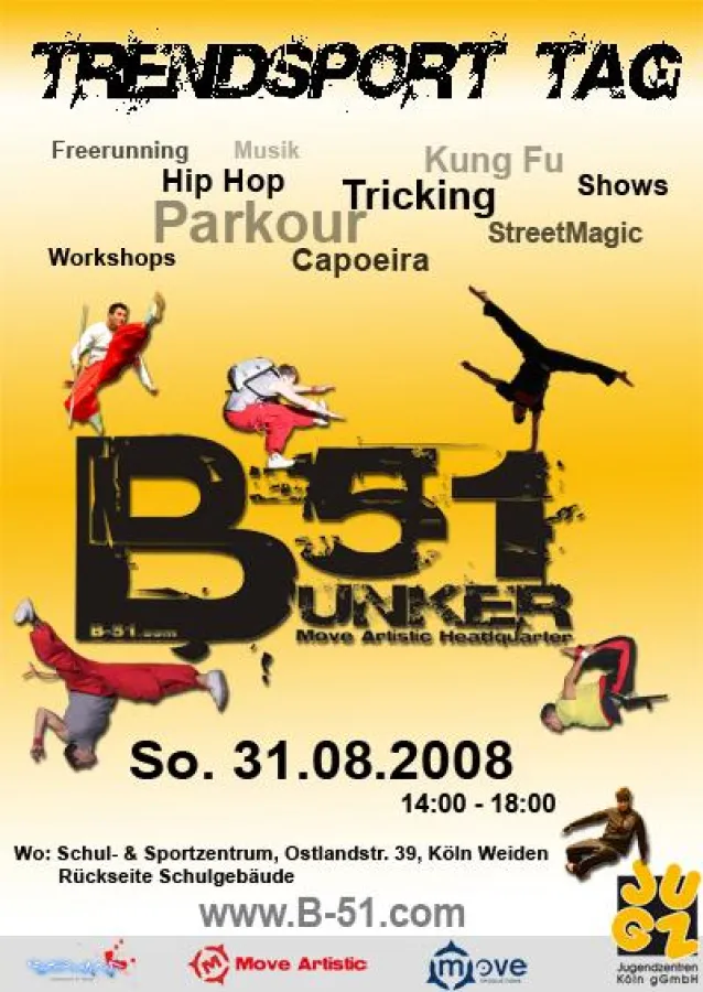 Im Schul- und Sportzentrum findet sich nun das B-51, das World-Headquarter des jungen Unternehmens, das sich diesen aufregenden und zukunftsweisenden Bewegungsformen verschrieben hat. Faszienierende Sprünge, Salti und Kicks, wie man sie sonst nur aus Filmen mit Jet Li und Jacki Chan kennt, werden am 31.08. nicht nur vorgestellt, es wird auch zum Mitmachen eingeladen. Wer immer schon einmal Parkour und Akrobatik lernen wollte und dies aus fachlicher Hand vermittelt bekommen möchte, kann an den Kurzworkshops an diesem Tag teilnehmen.