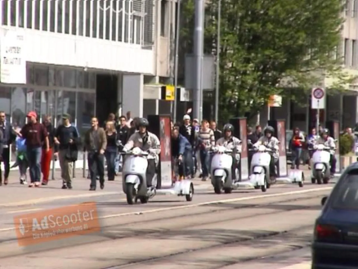 AdScooter sind eine Kombination aus Vespa und innovativem, beleuchtbarem Anhänger, der mit Werbeplakaten bestückt, an strategisch günstigen Stellen rund um die deutschen Bundesliga-Stadien positioniert wird.