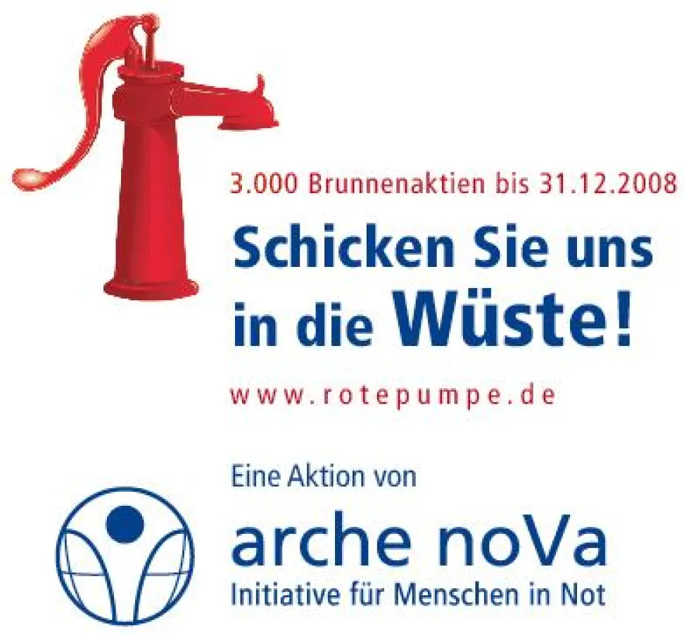 Wer sagt, dass Hilfsorganisationen und Aktien nicht zusammenpassen? 3.000 illustrierte, signierte und mit Seriennummer versehene Brunnenaktien im Wert von je 100 Euro gibt die Dresdner Hilfsorganisation arche noVa e.V. ab sofort an Interessenten aus. Die Brunnenaktien sollen den internationalen Einsatz der Organisation, die seit über 15 Jahren weltweit im Wassereinsatz ist und seit 1994 durchgehend das DZI Spendensiegel trägt, im Jahr 2009 sichern. „Mit dem Kauf der Brunnenaktien kann jede und jeder von uns dazu beitragen, dass Menschen (…) f…