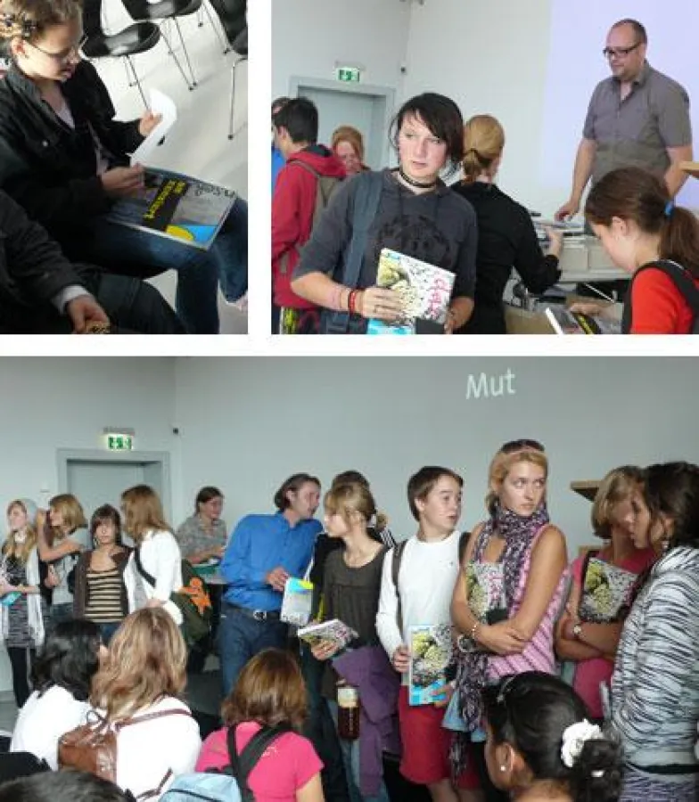 Corinna Lampadius vom Atlantic Forum Hamburg führte in das Projekt „MUT“ ein. Holger Schmidhuber und Rolf Mehnert (Initiative gestaltBildung) präsentierten das eigens gestaltete Skizzenbuch „unzensiert“. Die Kinder und Jugendlichen erhielten je ein Exemplar der Bücher, in dem sie sich in kreativ betätigen können.