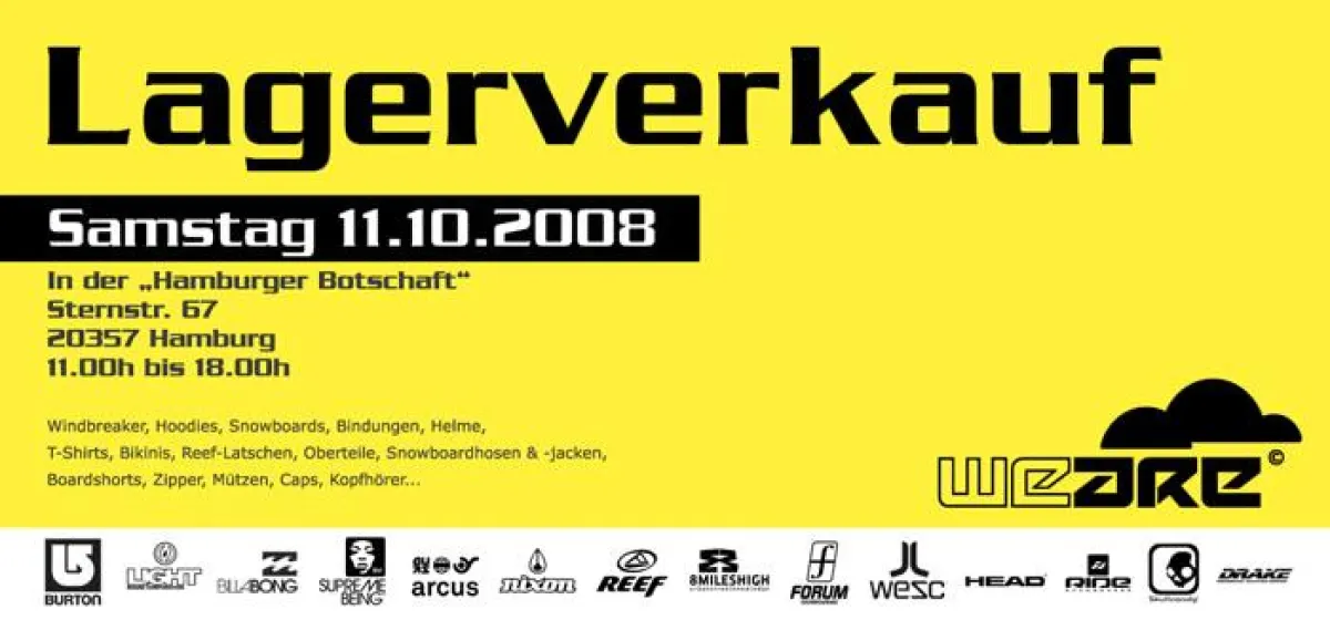 Am 11.10.09 veranstaltet die weare GmbH einen großen Lagerverkauf in der Hamburger Botschaft in der Schanze. Snowboards, Bindungen, Helme, Snowboardhosen und - jacken, sowie T-Shirts, Windbreaker, Kopfhörer und vieles mehr von renomierten Marken wie Burton, Billabong, Reef, Supreme Being, Head, Forum und Skullcandy sowie einigen anderen werden zum Verkauf zu Sonderpreisen angeboten.