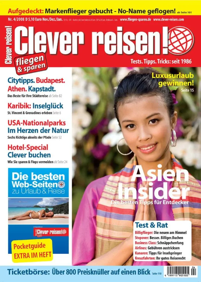(openPR) Duisburg, 08.10.2008. Dem Reisemagazin „Clever reisen!“ liegt in der Oktober-Ausgabe zusätzlich der mehr als 30 Seiten umfassende Pocket-Guide zum Thema „Die besten Web-Seiten für Urlaub & Reise“ bei. In Zusammenarbeit mit dem „Web-Adressbuch für Deutschland“ präsentiert der kompakte Guide die wirklich nützlichen Internetseiten für den perfekten Urlaub - vom Flugpreisvergleich bis zur Reise-Community. Gefiltert aus zehntausenden von Web-Seiten erwartet den Leser eine praktische Übersicht der besten Reiseseiten, inklusive einer jeweils kurzen Beschreibung sowie einer Auswahl an Screenshots. Die Ausgabe 4.08 der „Clever reisen!“ ist ab sofort am Kiosk für 5,10 Euro erhältlich.