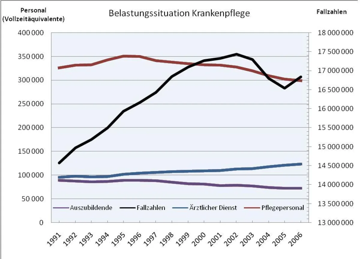 Auf der Seite der Belastungen stehen in besonders exponierter Stellung der fortschreitende Personalabbau einerseits sowie die kürzere Verweildauer der Patienten bei gleichzeitig zunehmender Fallzahl andererseits. So hat bspw. im Gegensatz zur positiven Personalentwicklung im ärztlichen Bereich im Sektor des Pflegepersonals zwischen 1991 und 2006 eine Reduzierung des Personals um 8,2% stattgefunden. Dies entspricht 26744 Vollzeitkräften. Fokussiert man nur auf die Entwicklung innerhalb der letzten 10 Jahre, so stellt sich die Situation noch dramatischer dar, da man zu einem Abbau von 12,8% (41810 Vollzeitäquivalente) gelangt.