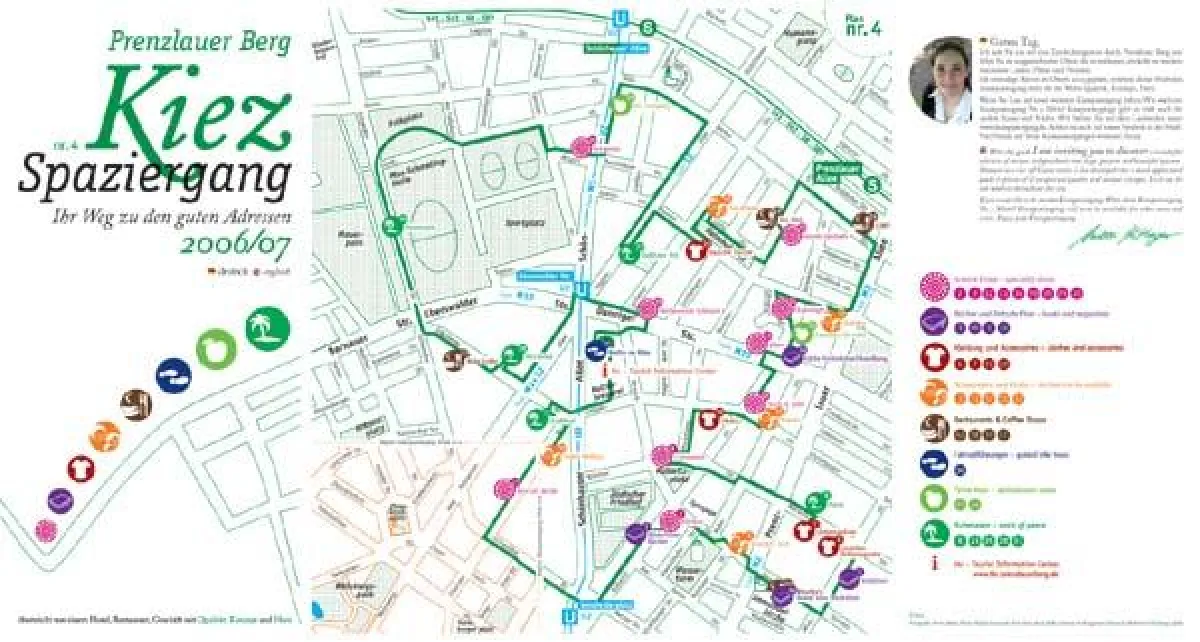 Wer der teuren Boutiquen und glitzernden Fassaden an der Friedrichstrasse in Berlin-Mitte überdrüssig ist, fährt mit der Straßen- oder S-Bahn eben nach Prenzlberg, flaniert durch die Kneipen und Cafés rund um den Kollwitz-Platz, schaut bei einem der zahlreichen Filmsets ein wenig zu – oder folgt der Route des „Kiezspaziergang“. Qualität, Konzept und wenig Herzschmerz stecken in den Ausarbeitungen; es ist bereits die vierte Ausgabe erschienen. Bei dem rund dreistündigen Rundweg streift man – ganz nebenbei – interessante Locations wie die Kulturbrauerei (ein Veranstaltungszentrum mit beliebtem Konzertangebot) oder den ruhigen Mauerpark (einst die Grenze zwischen West- und Ost-Berlin).