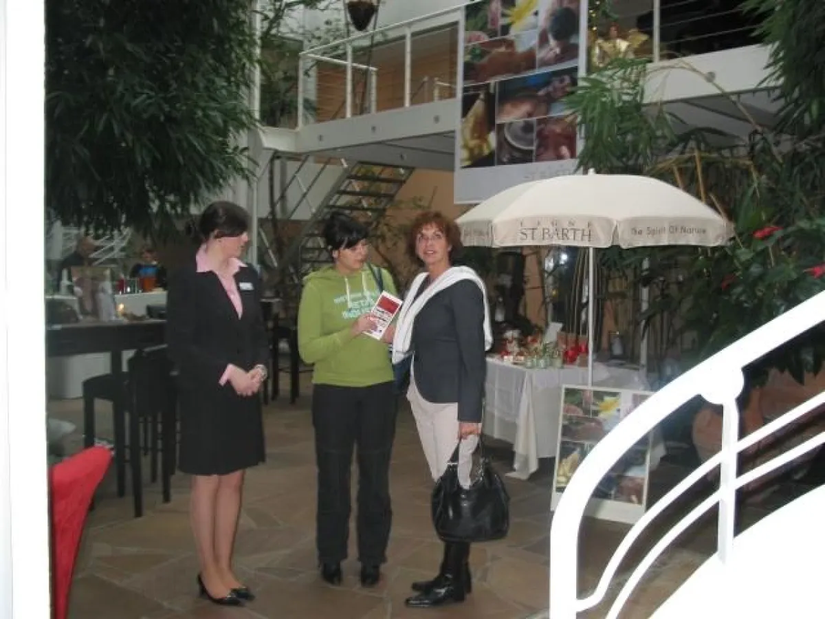 Interessierte Besucher – darunter auch einige wenige Männer – nutzten die Gelegenheit, um sich auf der Wellness-Piazza der Wutzschleife mit ihren tropischen Pflanzen in ungezwungener Atmosphäre über die hochwertigen Pflegeprodukte zu informieren. An den Präsentationsständen von LIGNE ST BARTH konnte man sich kompetent beraten lassen und erhielt ausführliches Informationsmaterial zur gesamten Pflegelinie. Wohltuende Kurzbehandlungen boten Gelegenheit, die Produkte von LIGNE ST BARTH hautnah kennen zu lernen und sorgten zugleich für die richtige Entspannung. Zur Wahl standen eine Gesichtsbehandlung mit Peeling und Gesichtsmassage, eine kleine Dekolleté-Massage, eine ST. BARTH Slimness-Beinmassage und ein Verwöhn-Aroma-Händeritual mit einem Koskospeeling. Einige der Besucherinnen waren davon so angetan, dass sie sich gerne auch ein zweites Mal verwöhnen ließen.