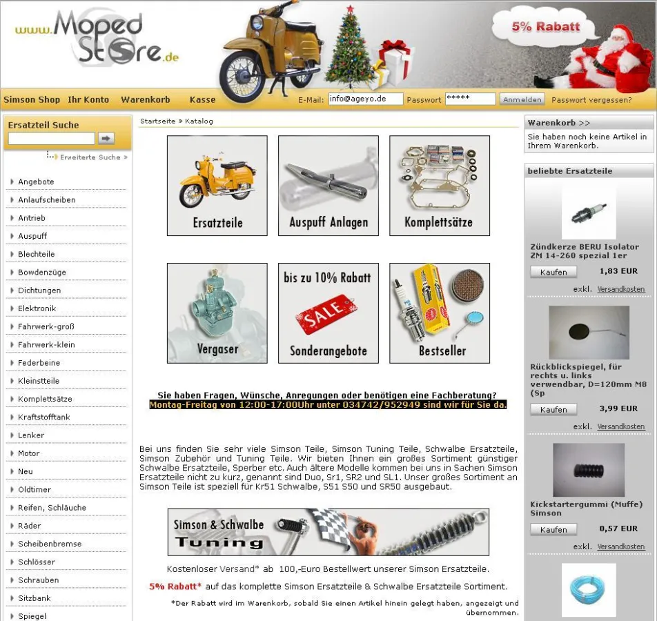 (openPR) Das im Jahr 2007 von Rene´ Krömer gegründete Unternehmen Mopedstore erfuhr im November 2008 ein Relaunch seines Onlineshops. Der Onlineshop wurde mit einem zukunftssicherem CSS Template neu gestaltet und um sinnvolle Module zur täglichen Abwicklung von Geschäftsabläufen erweitert. Die Umsetzung und Betreuung wird derzeit von der Ageyo Internet Marketing GbR durchgeführt, welche auch für das Design verantwortlich ist. Nach der Gründung im Jahre 2007 etablierte sich Rene´ Krömer innerhalb eines Jahres zu einer festen Grösse im Onlinehandel mit Simson Ersatzteilen aller Art. Die stetig steigenden Kundenzahl sowie ein Kundenkreis, welcher sich bis nach Zypern erstreckt, sind ein Beweis dafür, dass der Schritt in die Selbsständigkeit nicht verkehrt war. Seit dem 01.12.2008 ist der Mopedstore offizieller MZA Vertragshändler und kann somit seinen Kunden eine noch breitere Palette an Artikeln zur Verfügung stellen. Da das Sortiment stetig erweitert wird, stehen im Jahr 2009 weitere Umbaumaßnahmen an, um das Lager, welches jetzt schon mehr als 3500 Simson Ersatzteile beinnhaltet, auszubauen, um damit eine noch schnellere Verfügbarkeit seinen Kunden gegenüber zu gewährleisten. Das Programm des Mopedstore umfasst neben den Ersatzteile für Simson Mopeds auch Tuningteile und Zubehör für alles Simson Modelle.