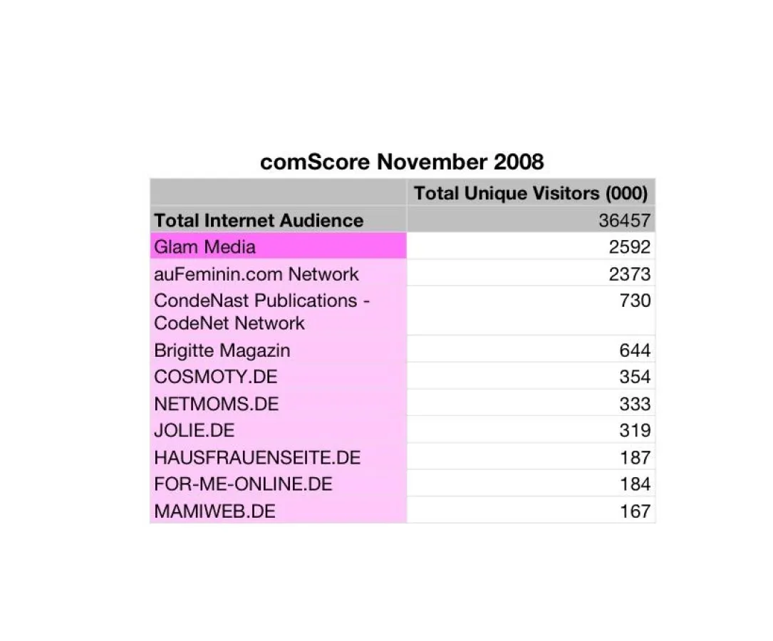 (openPR) Glam Media Deutschland, (glam.de, de. glammedia.com,) ist bereits sechs Monate nach dem Start die Nummer Eins bei der Zielgruppe Frauen im deutschsprachigen Internet. Laut comScore* erreicht GLAM rund 2,6 Millionen Unique User in dieser Zielgruppe. Das komplette GLAM Netzwerk wird mit dem ersten Quartal 2009 ebenso bei der AGOF ausgewiesen. Das Ergebnis des dynamischen Wachstums des Content-Netzwerks ist mehr als eine Verdopplung der Reichweite seit dem Launch im Juli 2008.