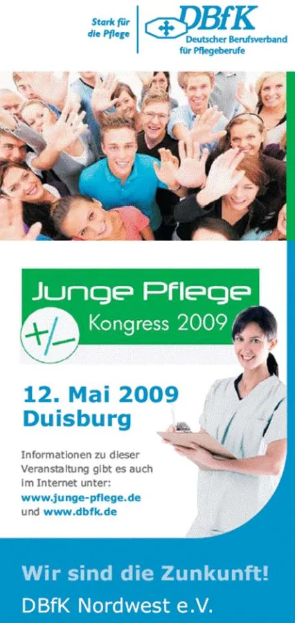 Der Junge Pflege Kongress findet am 12.Mai 2009 im Theater am Marientor in Duisburg statt. Die Veranstaltung ist von den Mitgliedern der Arbeitsgruppe junger Pflegender im DBfK Nordwest e.V. geplant und vorbereitet worden. Alle Informationen sind dem Internetangebot der Arbeitsgruppe unter der Adresse www.junge-pflege.de zu entnehmen.