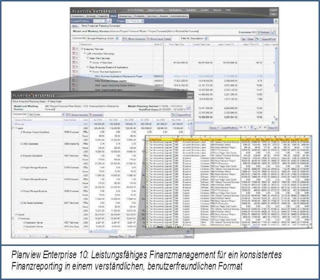 Die Planview Enterprise 10 Plattform integriert Finanzmanagement- und Planungswerkzeuge, die den Einsatz des Portfolio-Managements im Projekt- und Ressourcen-Management, in der strategischen Planung, in der Produktentwicklung sowie im Bereich der IT-Services ermöglichen und unterstützen. Dies gelingt auch durch die Integration wichtiger Finanzfunktionen und ihre Darstellung in einer vertrauten Benutzeroberfläche. Planview Enterprise 10 gibt ein vollständiges Bild der Ressourcen, der Wertschöpfung und der dem Aufwand zuordenbaren Kosten.