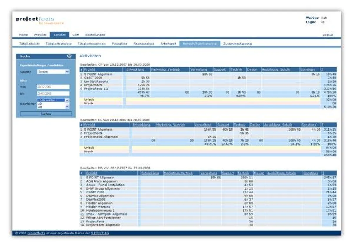 projectfacts ist ein webbasiertes Zeiterfassungs- und Projektmanagementsystem. Wesentlicher Vorteil ist die Verarbeitung erfasster Daten wie Arbeits- und Projektzeiten sowie von Einnahmen und Ausgaben – also von Informationen die meist nur verteilt im Unternehmen vorliegen.