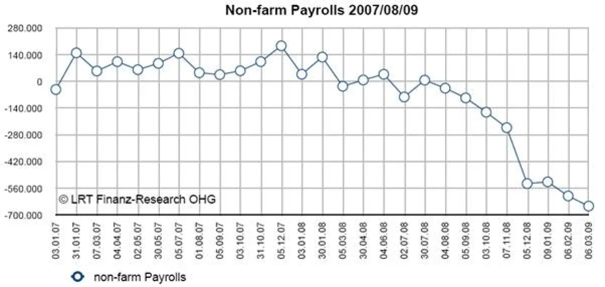 Die Wirtschaftsdaten bargen, wenig überraschend, nicht viele erfreuliche Nachrichten. Der Arbeitsmarktbericht vom Freitag, den 6. März war wie erwartet schlecht. Die Arbeitslosenquote liegt nun bei 8,1% und im Monat Februar gingen 651.000 Jobs verloren. Seit Anfang der Rezession im Dezember 2007 gingen insgesamt 4,38 Millionen Jobs verloren.