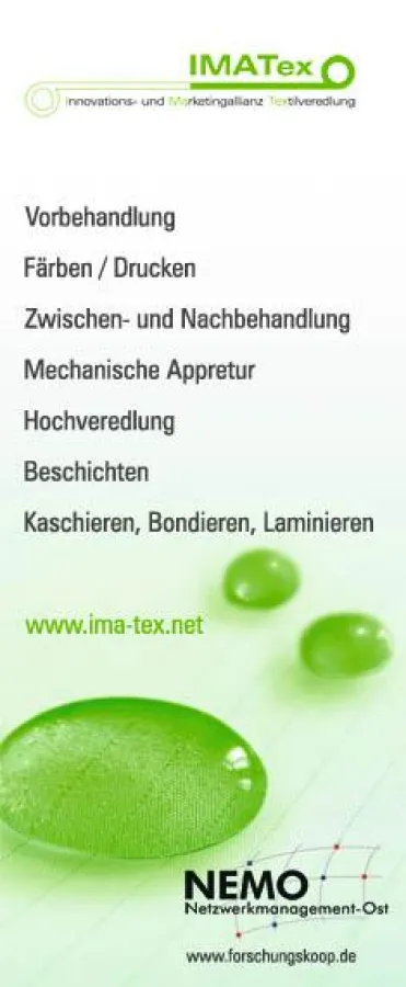 Das Leistungsangebot der IMATex-Mitglieder wird in einem Katalog sowie auf der Internet-Plattform www.ima-tex.net vorgestellt. Herausgeber der Informationsmaterialien ist der Chemnitzer INNtex Innovation Netzwerk Textil e.V., der die Koordination dieses aus dem Programm „Netzwerkmanagement Ost“ (NEMO) des Bundes geförderten Projekts übernommen hat.