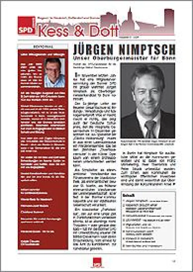 In einer Auflage von rund 7000 Stück ließ die SPD Bonn-Süd die März-Ausgabe der parteieigenen Publikation für Kessenich, Dottendorf und Gronau per Postwurfsendung an die Haushalte ihres Wahlbezirks verteilen. Die Leser wurden diesmal mit einem neuen Design und frischen Layout überrascht. Themen aus dem lokalen Umfeld und ein Rückblick auf den Kessenicher Karneval präsentierten sich im angenehmen Magazin-Look und mit freundlicher Farbgebung.