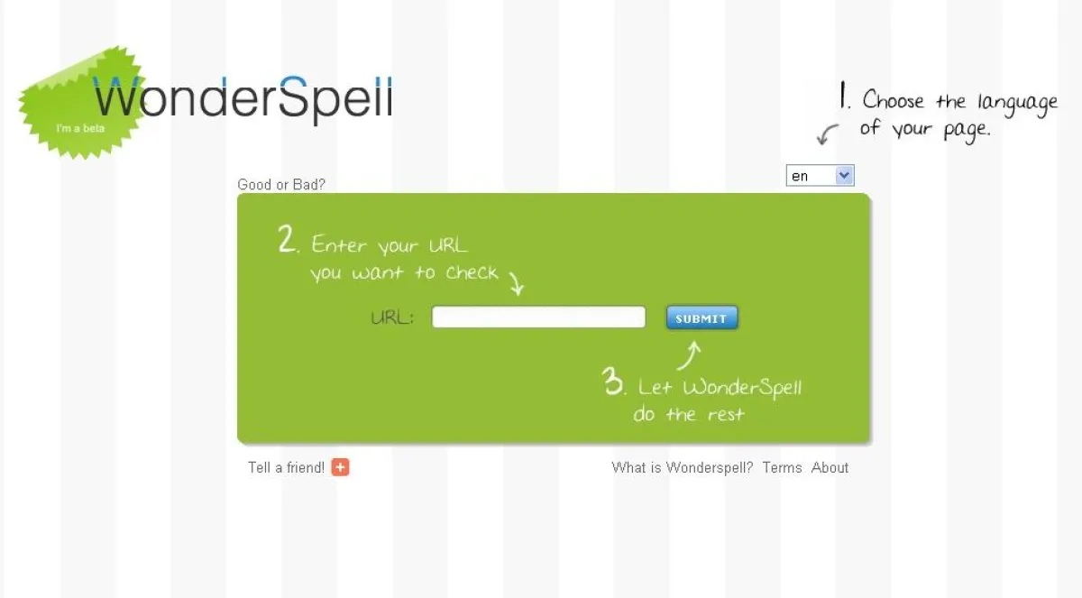Einfach die Sprache wählen, URL eingeben und abschicken. Wonderspell überprüft die Webseite und zeigt mögliche Rechtschreibfehler an.
