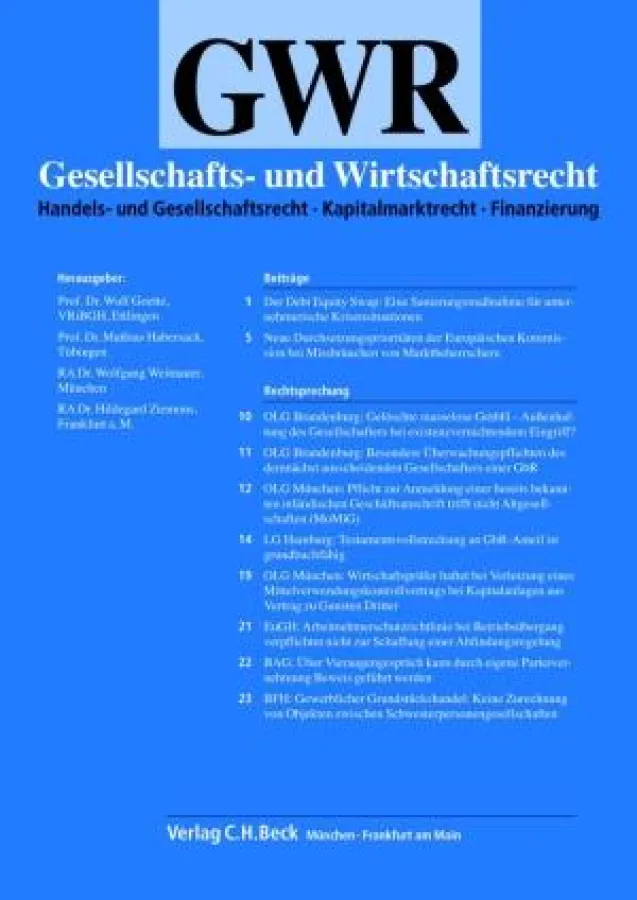 Außerdem ermöglicht das Abonnement über die juristische Datenbank beck-online (www.beck-online.de) exklusiven Zugriff auf das Modul „GWR Online“ (www.gwr-online.de). Neben einem Archiv der Zeitschrift GWR enthält das Online-Modul sämtliche im Heft besprochenen Urteile im Volltext. Darüber hinaus lassen sich umfassende Gesetzestexte zum Handels- und Gesellschaftsrecht sowie zum Themenbereich Mergers & Acquisitions abrufen. Weiterhin enthält „GWR-Online“ die vollständigen Archive der Beck’schen Fachdienste Handels- und Gesellschaftsrecht sowie Mergers & Acquisitions.