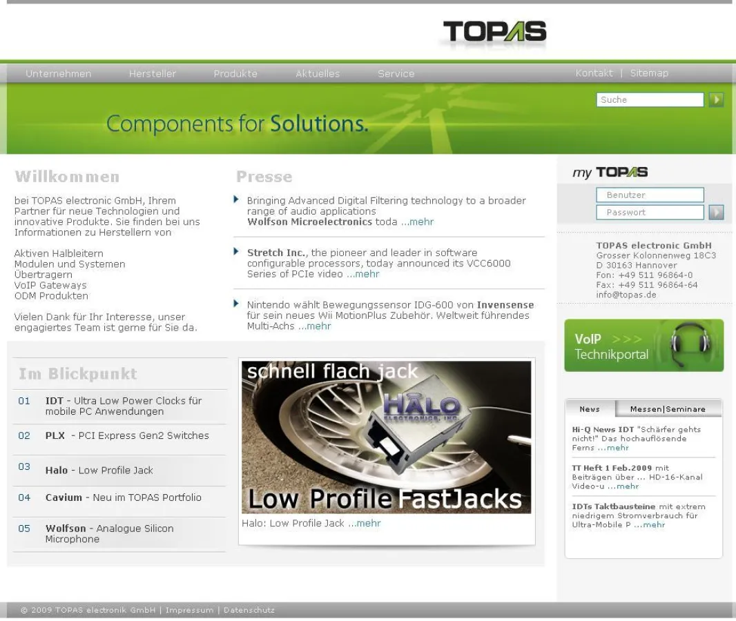 Die Redakteursoberfläche präsentiert sich mit den Erweiterungen im TYPO3 Backend portalweit einheitlich, so dass das zukünftige Serviceangebot auf Basis von übersichtlichen Administrations- und Erfassungsmasken im Kontext des TYPO3 Systems von TOPAS einfach erweitert und bearbeitet werden kann. Das Unternehmens-Portal der TOPAS electronic GmbH verbindet mit dem Relaunch ein modernes Layout mit effizienter Benutzerführung und neuen Kundenservices.