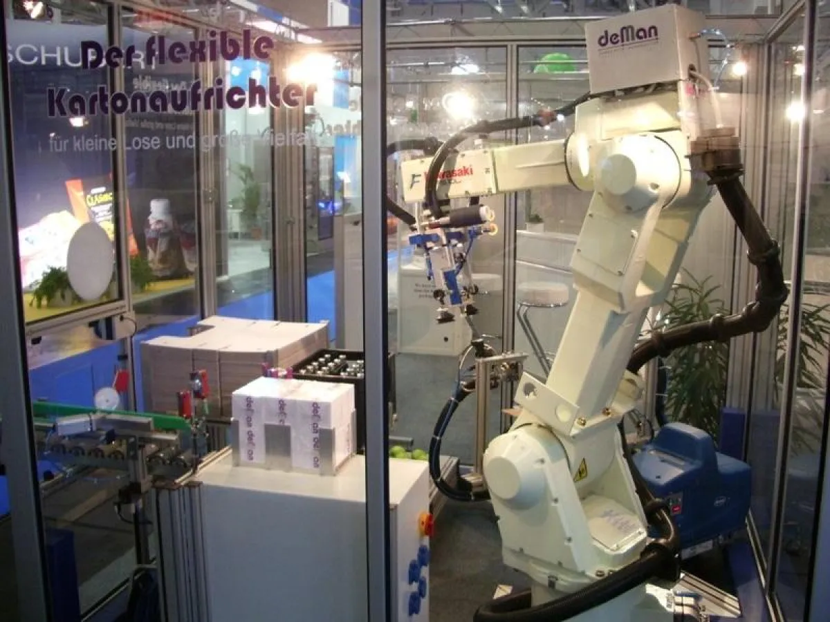 Das Highlight: Der Roboter packt den Messebesuchern auf Knopfdruck ein Lunchpaket! Bereits auf der LogiMat und der AnugaFoodTec stieß die Aktion auf großes Interesse. Auch die pro Wirtschaft GT GmbH war von der Idee begeistert und sicherte sich die Roboterzelle als Ausstellungsobjekt für ihre Fläche auf dem OWL Gemeinschaftsstand. Hier faltet der Roboter auf Knopfdruck einen Karton auf und befüllt diesen mit allen Zutaten für einen kleinen Snack zwischendurch. Natürlich kann das „Lunchpaket“ von den Besuchern mitgenommen werden. Mit der Zelle demonstriert de Man seine hohe Kompetenz in der Zusammenstellung von Mischkartons mit unterschiedlichstem Inhalt. Die präsentierte Roboterzelle zeichnet sich durch höchste Flexibilität aus und kann individuell an unterschiedlichste Karton- und Produktarten und beliebig erweitert werden. So können die Kartons auf Kundenwunsch z.B. auch verschlossen und etikettiert werden. Damit erfüllt die Entwicklung von de Man nicht nur die aktuellen Anforderungen an fortschrittliche Verpackungsautomaten, sondern lässt dem Anwender auch einen ungewöhnlich großen Handlungsspielraum für zukünftige Aufgabenstellungen.