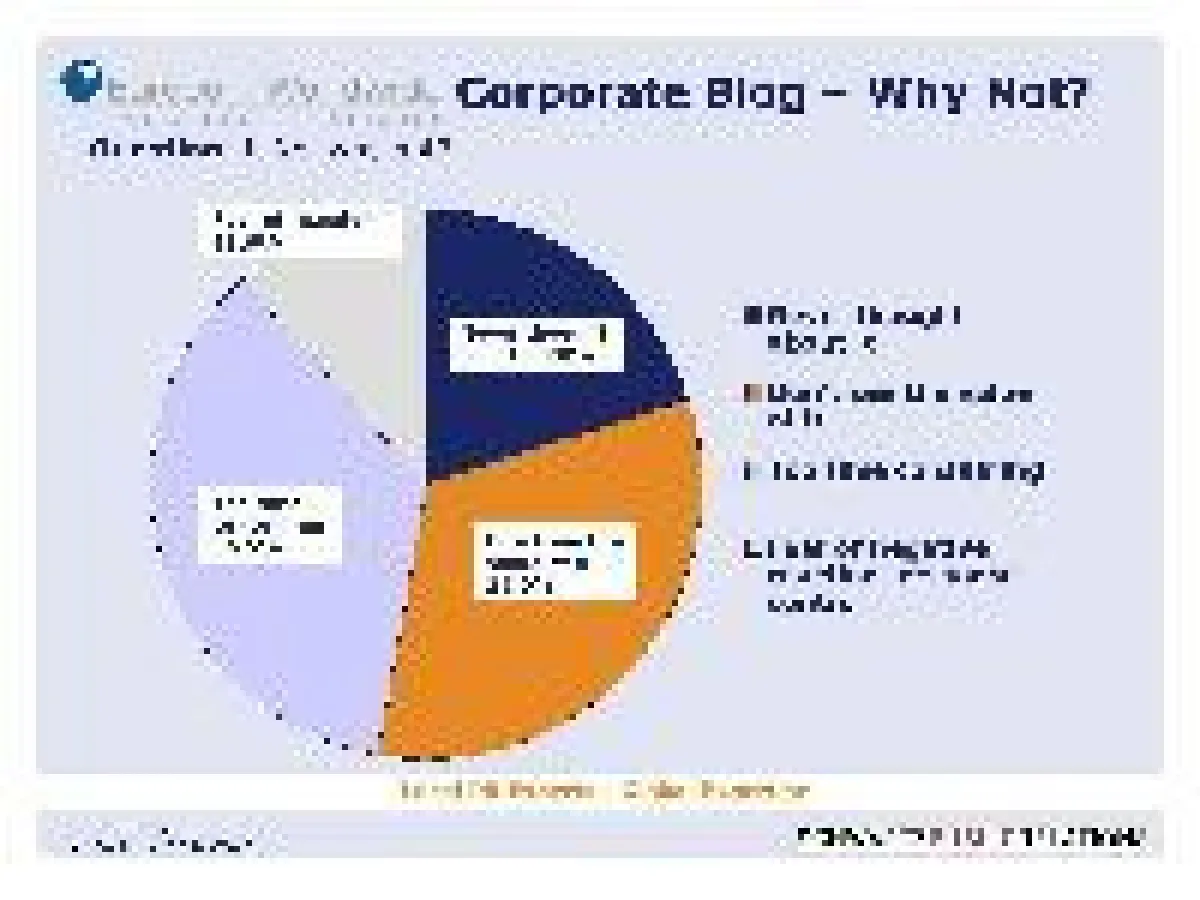 Laut Umfrage von Eurocom Worldwide unterhält nur ein Drittel der befragten Unternehmen einen eigenen Blog. Die Mehrheit verzichtet nach wie vor auf Blogs als firmeneigenes Kommunikationsmedium. Während 36% der Teilnehmer den hohen Aufwand scheuen, einen eigenen Blog zu betreiben, befürchten sogar 12%, mit Blogs negativ aufzufallen. 33% verbinden mit einem Firmenblog keinen Mehrwert und ein Fünftel der Befragten hat sich mit der Frage nach einem eigenen Blog noch gar nicht auseinandergesetzt.