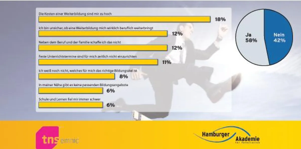 Das Ergebnis: Auf Platz eins der größten Hürden steht der Kostenfaktor. 18 Prozent der Weiterbildungsinteressierten gaben an, dass ihnen eine Weiterbildungsmaßnahme zu teuer ist. Platz zwei teilen sich mit jeweils 12 Prozent die Aussage, eine Weiterbildung neben Beruf und Familie sei zeitlich nicht zu schaffen und die Unsicherheit, ob eine Weiterbildungsmaßnahme wirklich den gewünschten beruflichen Erfolg bringt. Die Aussage, feste Unterrichtstermine seien zeitlich nicht einzurichten, führten 11 Prozent der Weiterbildungsinteressierten als Hinderungsgrund an. Immerhin würden sich 27 Prozent der Weiterbildungsinteressierten ohne Wenn und Aber für eine zusätzliche Qualifizierung im Job engagieren.
