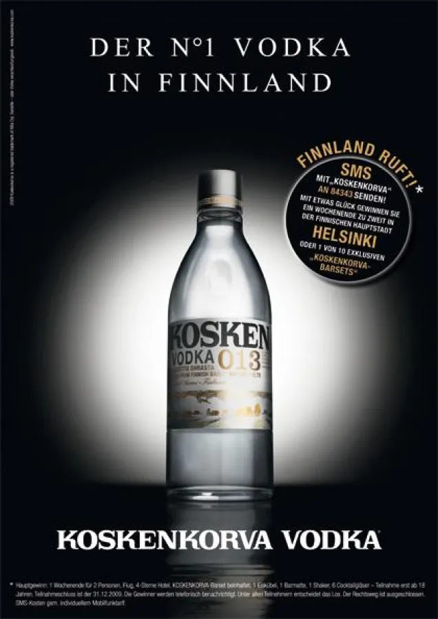KOSKENKORVA ist ein junger, stylischer Vodka, der vor allem die Zielgruppe der 18-30 jährigen lifestyle-orientierten Männer und Frauen anspricht.