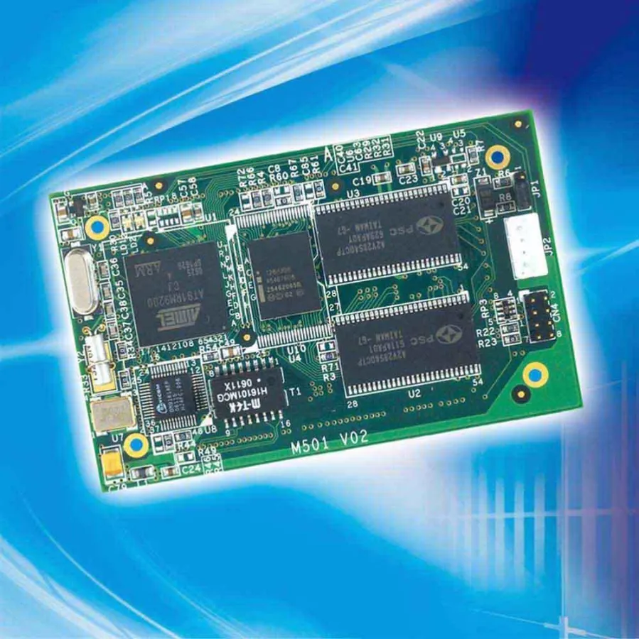 Auf der Leiterplatte mit 80 x 50mm finden sich außer 64MB RAM noch 16MB NOR-Flash für das Betriebssystem und die Applikation. Das Modul ist mit einem 10/100 Mbps Ethernet, zwei USB und vier UARTs sehr kommunikativ und stellt über SPI, I2C und Adress-/Datenbus genug Ressourcen für eigene Erweiterungen zur Verfügung.
