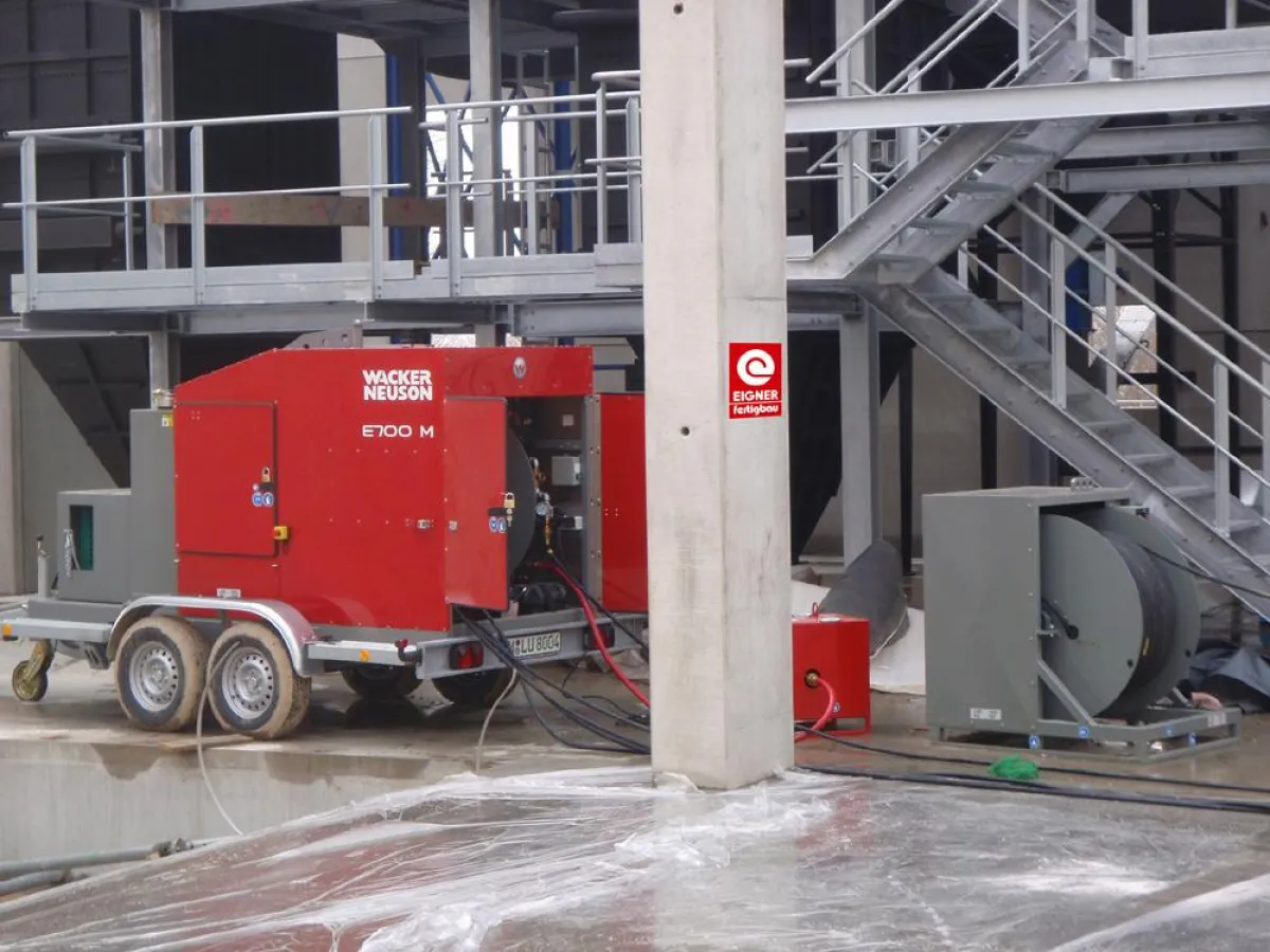 Wegen der sehr engen Terminvorgaben musste schnell gearbeitet werden. Direkt nach dem Auftauen des Untergrundes wurde der Beton eingebaut. An den beiden folgenden Tagen hat der E 700M den abbindenden Beton konstant auf der optimalen Abbindetemperatur von etwa 25 °C gehalten. Schon am dritten Tag nach dem Betonieren konnte der Hallenboden mit bis zu zwölf Tonnen schweren Wandelementen belastet werden. Etwa eine Woche später wurden die eingebauten Betonfertigteilwände mit einer Zwischendecke zusätzlich belastet. Nach nur etwa zehn Tagen wurde ein Teilbereich der Bodenplatte mit einem Kessel des Kraftwerks, der ca. 80 Tonnen wog, zusätzlich belastet. „Der Betonboden hat sich als extrem tragfähig erwiesen“, so Walter. „Die notwendige hohe Qualität und Festigkeit des Betonbodens ist durch eine entsprechenden Betongüte und die Betonnachbehandlung mit dem E 700M voll und ganz zustande gekommen. Außerdem hat uns das Gerät mehrere Wochen Zeit gespart und uns ermöglicht, den straffen Zeitplan einzuhalten.“