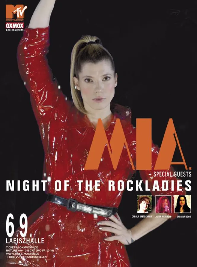 Hamburg, Mai 2009 - Am 6. September 2009 wird in der Hamburger Laeiszhalle feinster Rock aus Deutschland zelebriert. Mit der „NIGHT OF THE ROCKLADIES“ findet erstmalig eine generationenübergreifende Reunion einiger der größten weiblichen Rocklegenden der Republik statt. Als Highlight und Hauptact des Abends geben die sympathischen Berliner Poprocker von MIA. um die charismatische Frontfrau Mieze ihr gesamtes, mehrstündiges Konzertrepertoire zum Besten. Zusätzlich zu Miezes mitreißender Performance in immer wechselnden Kostümen, geben weitere Powerfrauen an diesem Abend den Ton an: Als Special Guest im barocken Konzertsaal angekündigt haben sich Carola Kretschmer, Jutta Weinhold und Sabrina Noor. Der Vorverkauf hat bereits begonnen.