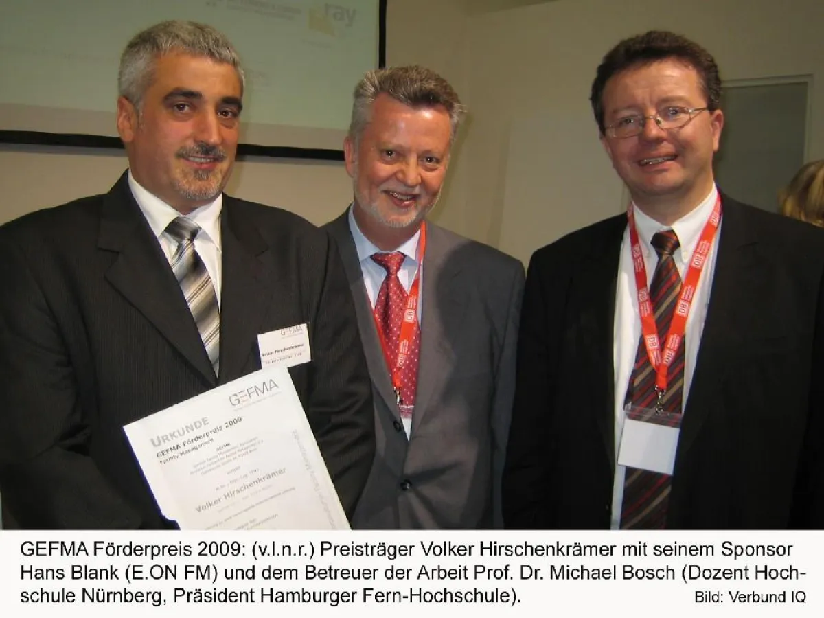 „Das Thema Facility Management ist für Wasserversorgungsunternehmen noch ziemlich weit weg“, sagt Volker Hirschenkrämer, der sich freut, einen Beitrag für die Branche leisten zu können. In diesem Kontext weiß Hirschenkrämer den Preis und die damit verbundene Anerkennung zu schätzen. Die theoretischen Kenntnisse eignete sich Hirschenkrämer während seiner Weiterbildung zum Facility Manager an. Vom Oktober 2006 bis März 2008 absolvierte der 46-jährige Maschinenbauingenieur mit großem Erfolg den berufsbegleitenden Masterstudiengang Facility Management in Nürnberg. Diesen Masterstudiengang veranstaltet die Verbund IQ gGmbH für die kooperierenden Hochschulen Nürnberg und München.