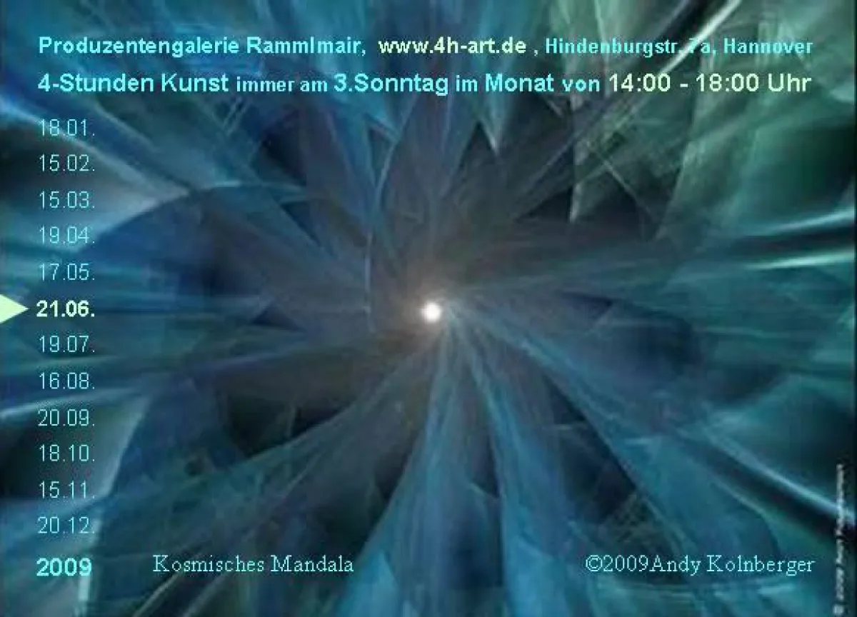 (openPR) Die Produzentengalerie Rammlmair “4h-art” zeigt am Sonntag, 21. Juni 2009, von 14:00 bis 18:00 Uhr Arbeiten von Andy Kollnberger unter dem Titel “LichtStilleDunkelheit”. Kosmische Mandalas, digital erstellt, auf Leinwand oder Papier großformatig gedruckt. Weiterhin wir der von dem Künstler selbst produzierter Film " Club Markiz " gezeigt. Ein Raumflug durch phantastische Welten.