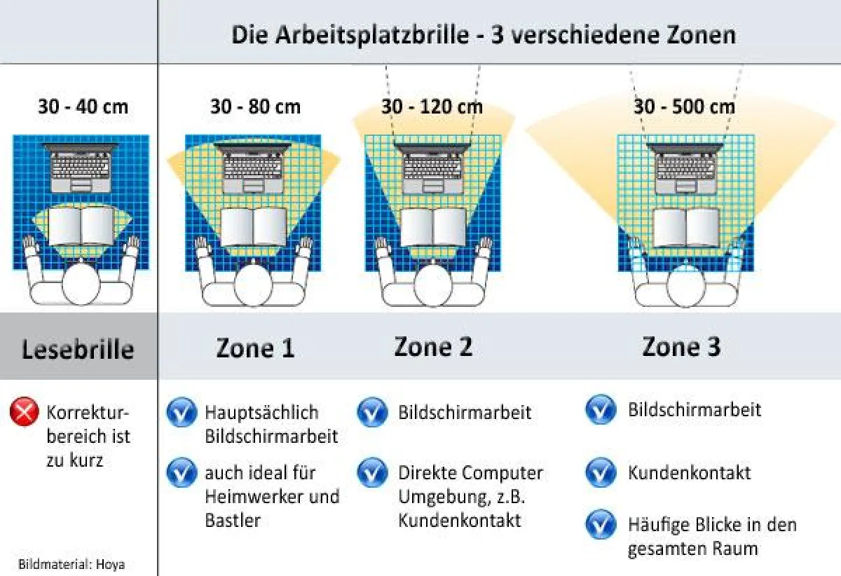 Eine Lesebrille ist nur für einen Leseabstand von 30 bis 40 cm tauglich – der Korrekturbereich bei der Bildschirmarbeit variiert jedoch, da das Auge von Monitor, zu Tastatur, zum Schreibtisch und zu Kollegen schweift. Bei einer herkömmlichen Gleitsichtbrille ist der, für die Computerarbeit wichtige Mittelbereich nur in einem schmalen Teil des Glases korrigiert – der Monitor kann demnach nicht in voller Breite scharf gesehen werden.