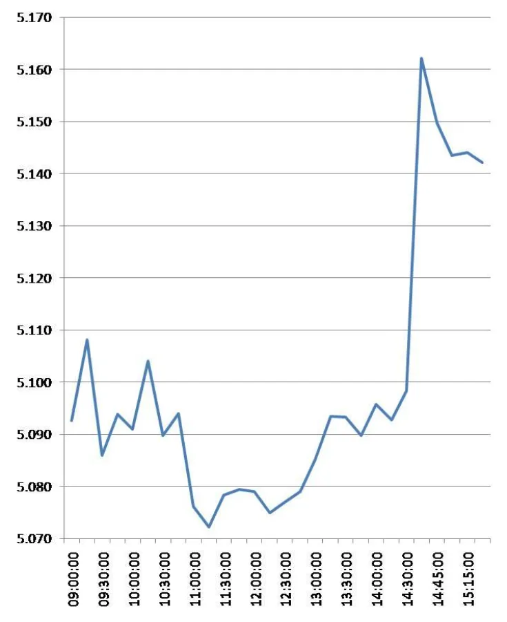 Und nun werfen wir mal einen Blick, was innerhalb weniger Minuten – von der Veröffentlichung über Lesen bis hin zum Interpretieren und dementsprechend Handeln – passiert ist. Um 14:39:51 h erreicht der DAX seinen Tageshöchststand von 5.162,12 Punkten. Keine 10 Minuten für 1,25% Kurswachstum. Alle wesentlichen Indizes folgten diesem Verlauf. Das ist Globalisierung auf Börsianisch.