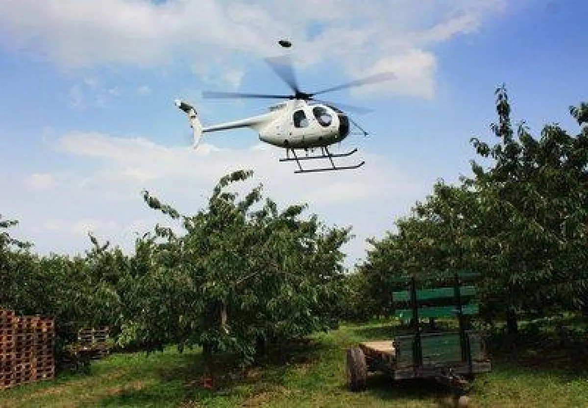 Seit Jahren bereits werden die Süßkirschen nach Regenfällen durch Rotorblätter von Hubschraubern im Tiefflug getrocknet. Verhindert werden soll, dass die Kirschen platzen.